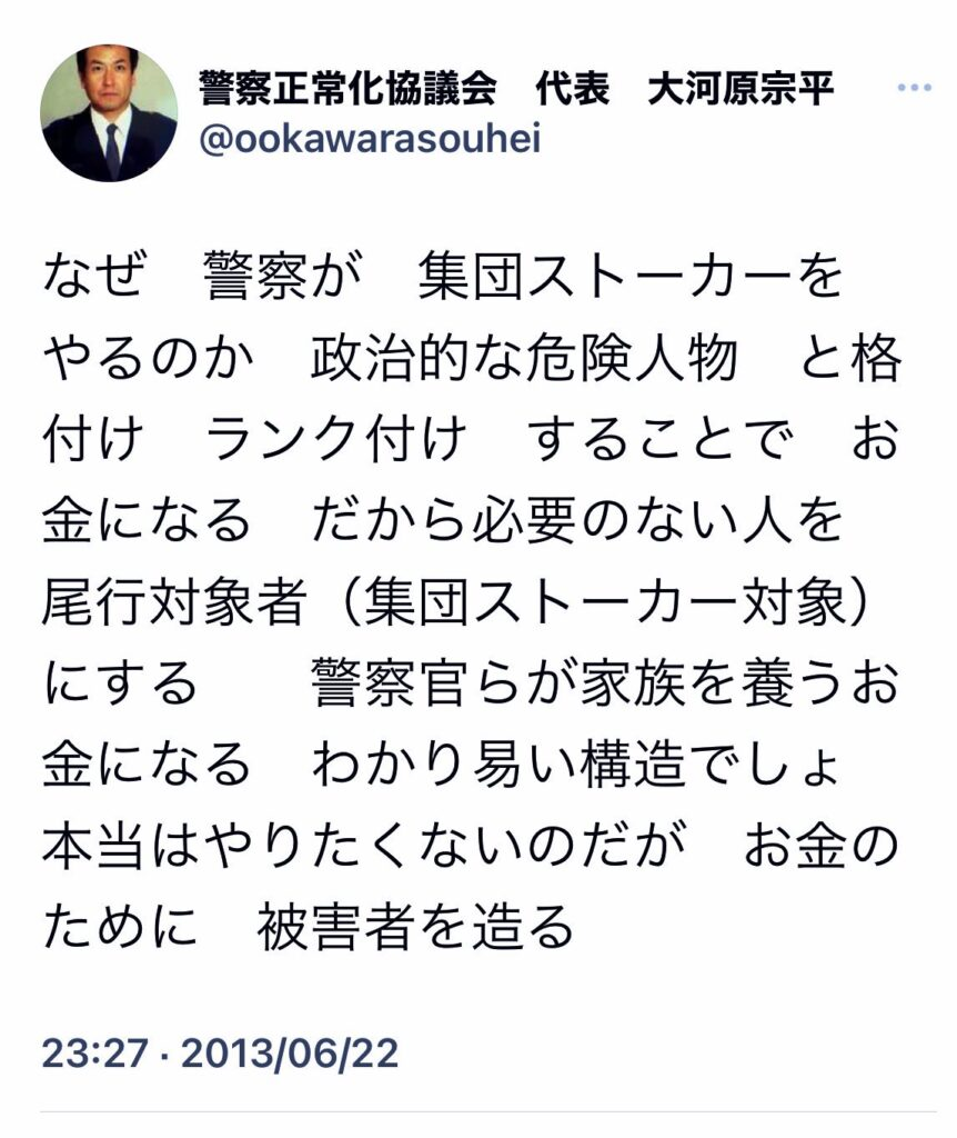 Q「聞いて欲しい内容ですが、警察官が被害者をマークする過程を聞いて欲しいのです。どのような情報を得て被害者をマークするのか?被害者をマークする日はどこからの情報で尾行活動をするのか?住所や顔写真のみから自分自身だけで被害者の内情を調べるのか?その辺の辺りが重要になります。詳しく聞いて欲しいです」